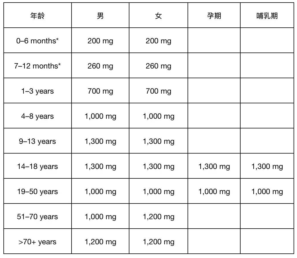 The daily recommended intake of calcium is as follows: