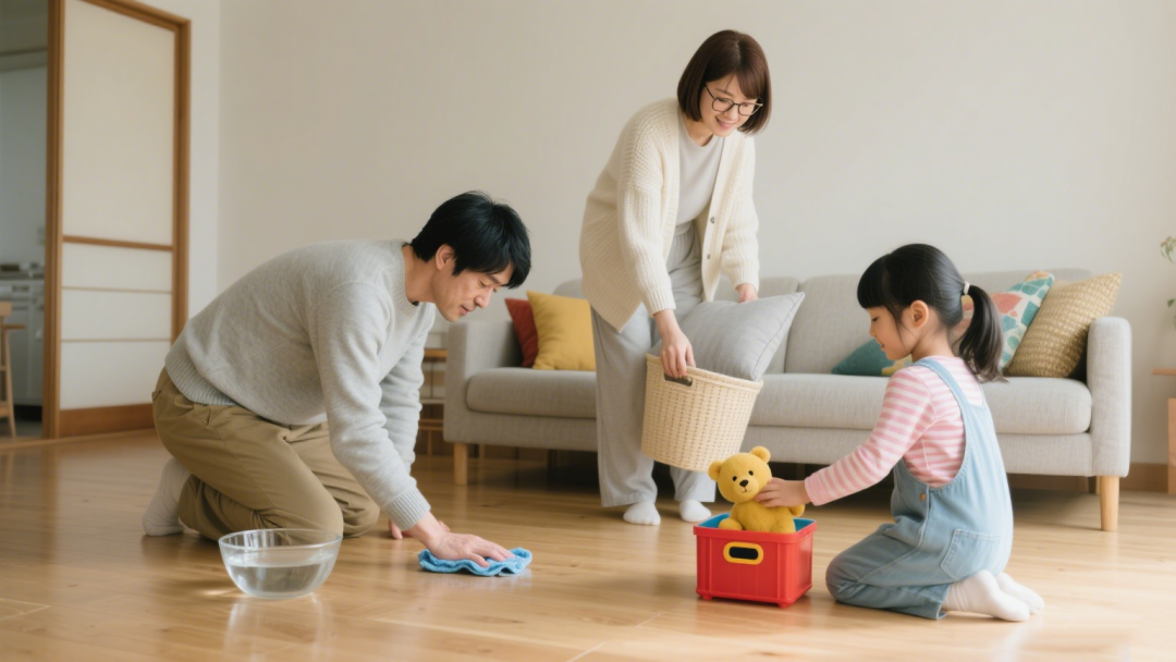 ● Weekend cleaning, Dad wipes the windows, Mom mops the floor, and the child hands over the cloth, finally the whole family enjoys the “shining living room” together;
