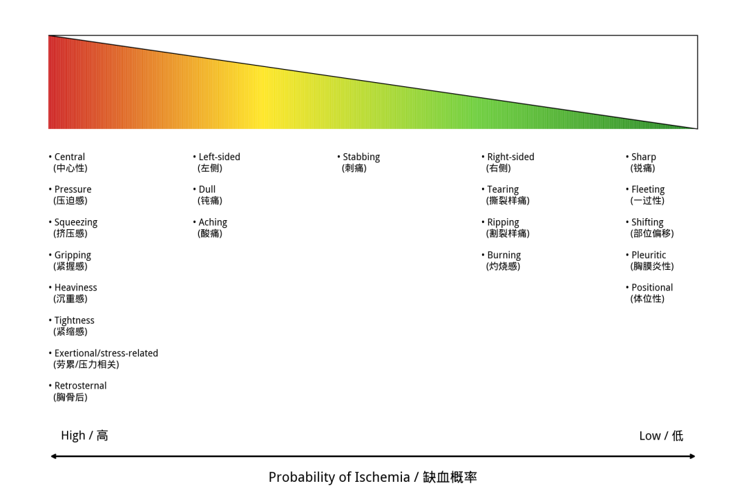 The following figure: Myocardial ischemic chest pain traffic light reference diagram shows that the redder, the more dangerous it is, and the greener, the lower the correlation with myocardial ischemia.