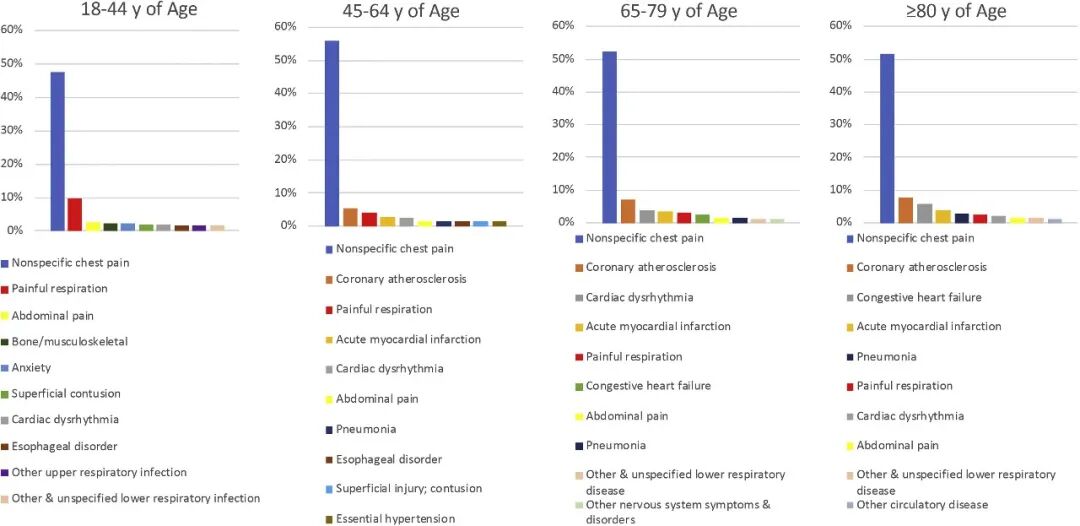 Data from JAMA shows the types of chest pain encountered in American emergency departments and their distribution across different ages. From left to right, the proportion of cardiomyogenic chest pain increases with age, and over the age of 65, the chest pain caused by basic heart problems also gradually increases; while before the age of 45, the proportion of cardiomyogenic chest pain is far less than 5%.
