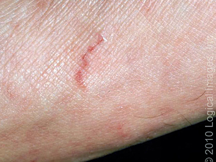A typical skin manifestation of scabies is multiple red papules that are often scratched open. Sometimes, 2-15mm long gray, red, or brown serpentine fine lines, i.e., tunnels, can be seen. Tunnels are another characteristic manifestation of scabies , but they are usually not visible due to skin scratching or secondary infections.