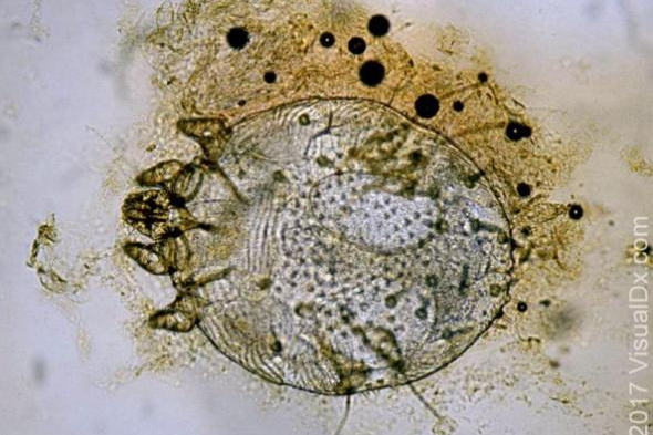 Scabies mites are tiny, with adult bodies measuring about 0.3-0.5mm in length, ranging from milky white to brown, almost invisible to the naked eye, with four pairs of legs, male mites are slightly smaller, female mites are slightly larger, female mites are the primary causative agents (females tunnel and lay eggs in the skin, causing inflammatory reactions that lead to severe itching) .