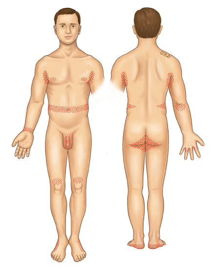 Left: Scabies; Upper Right: Acne; Lower Right: Mosquito Bites