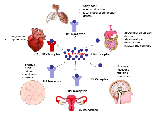 Excessive histamine entering the body can cause many discomforts,mainly gastrointestinal discomfort such as abdominal pain, diarrhea, bloating, nausea, and vomiting, skin(hives, erythema), brain(headache, dizziness), respiratory tract(runny nose, cough), cardiovascular system(accelerated heartbeat)may also have corresponding manifestations.