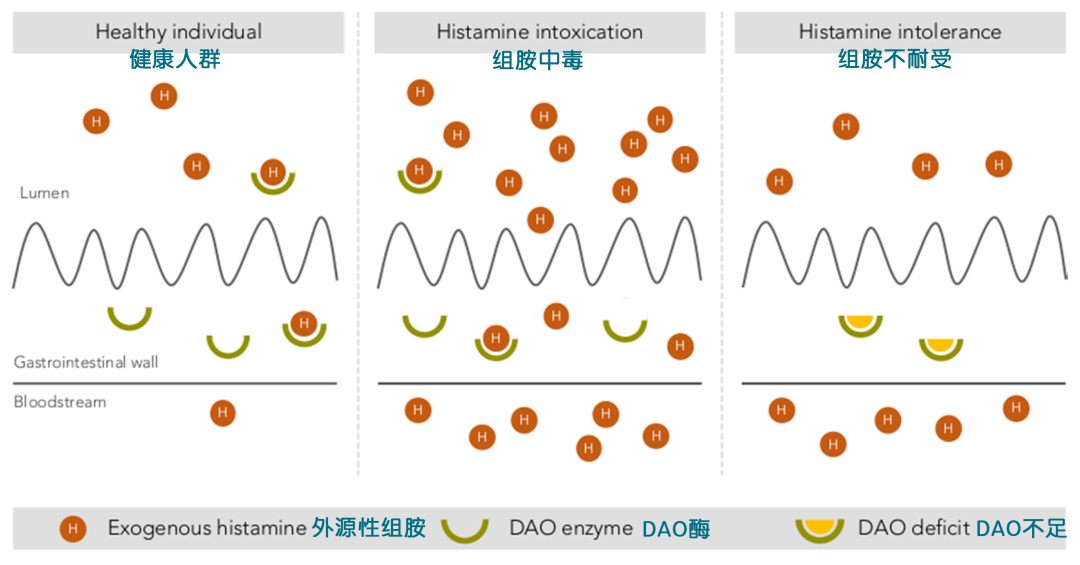 As shown in the figure below, unlike histamine poisoning caused by consuming foods with a large amount of histamine (e.g., spoiled fish), histamine intolerance is more about these two enzymes not fully playing their role in breaking down histamine.